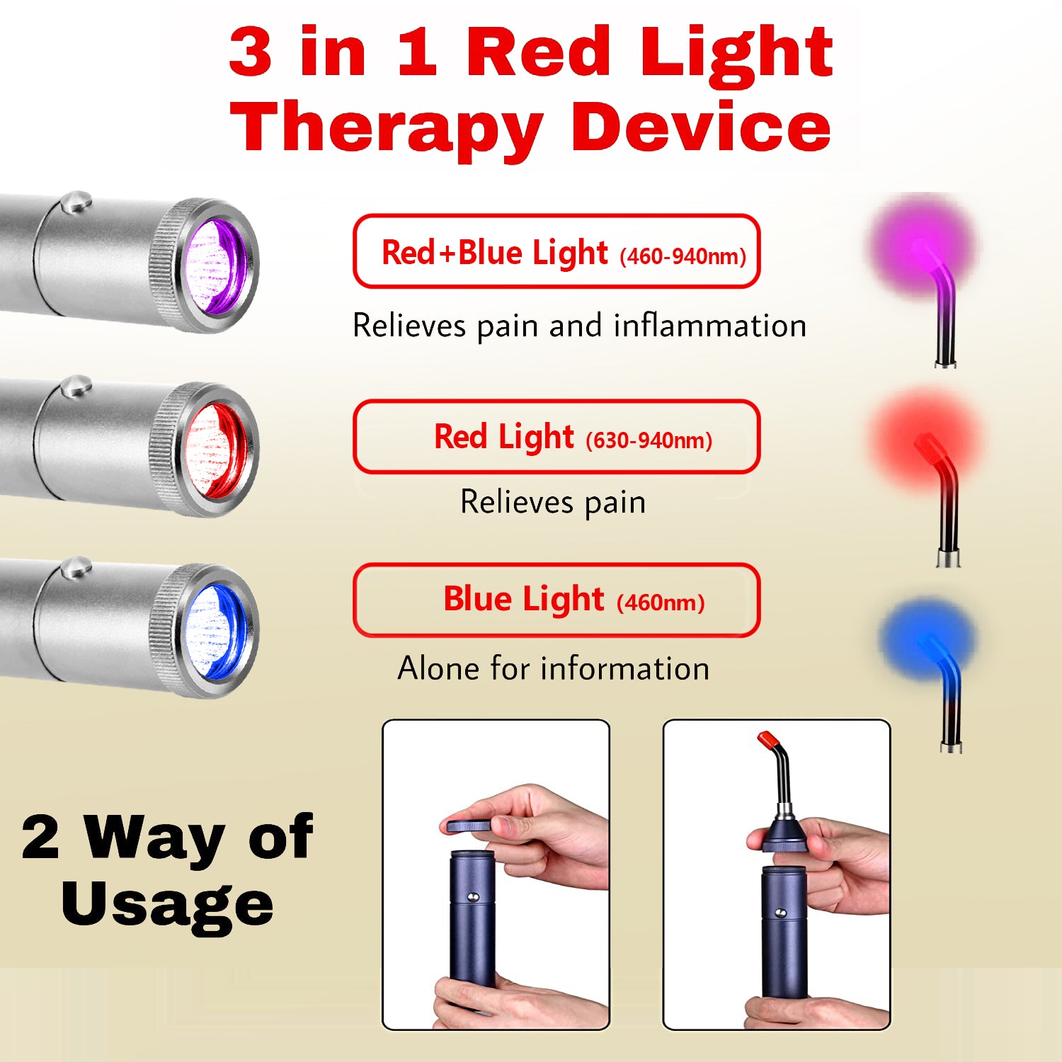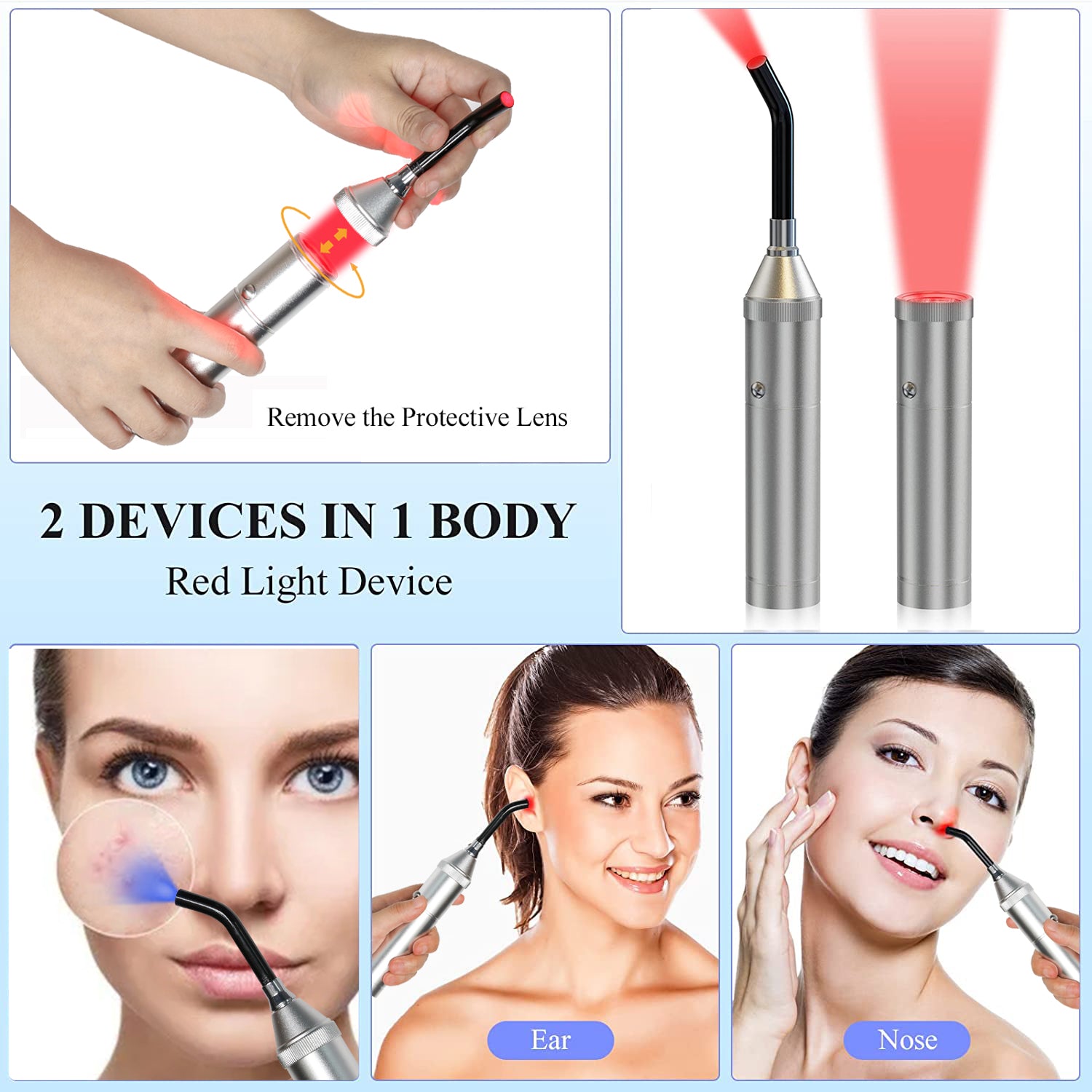 Il dispositivo è piccolo, leggero e pratico, ideale da tenere sempre con sé, a casa o in viaggio. È dotato di una torcia con luce rossa e infrarossa, entrambe specifiche per i trattamenti agli occhi, e di una fibra ottica di precisione per un trattamento mirato. È importante notare che la luce infrarossa non è visibile all’occhio umano, perciò i LED potrebbero sembrare spenti quando in realtà sono attivi e perfettamente funzionanti.
