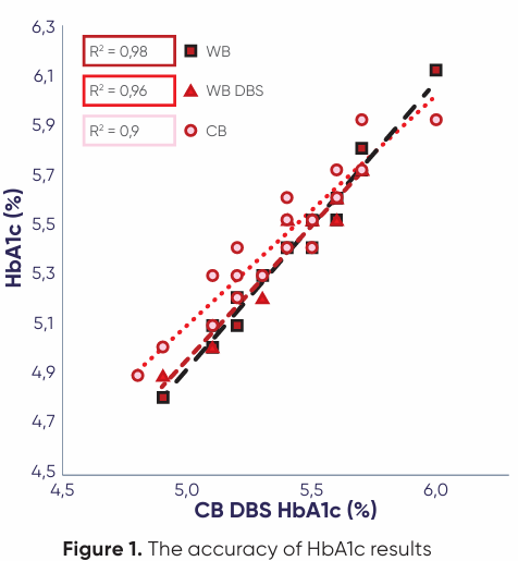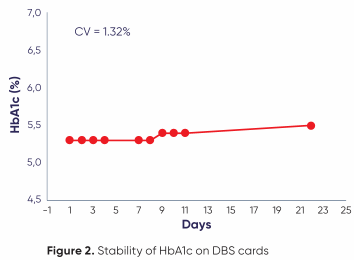 For 22 days, HbA1c remains stable (%CV < 2 %) on the dried blood spot (DBS) card (Figure 2).