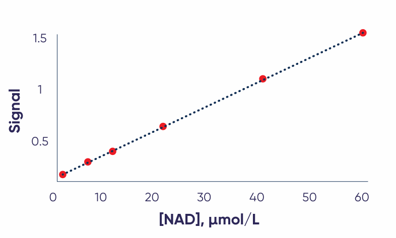 NAD is measured according to a calibration curve received against the NAD standard (Figure 1). A typical calibration curve is conducted using NAD concentration range of 0-60 µmol/L (accounting for dilution),