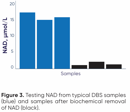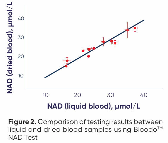 The BloodoTM NAD test was validated by comparing the assay results between liquid and DBS samples (R2=0.94) (Figure 2). The comparison demonstrated excellent correlation, indicating that the DBS samples align closely with the liquid blood samples. To validate that only NAD is being assayed, it was selectively removed from samples using NAD-specific enzymes (Figure 3). Normal samples showed typical NAD levels, while samples with NAD removed had significantly lower levels, confirming the BloodoTM NAD Test's specificity.