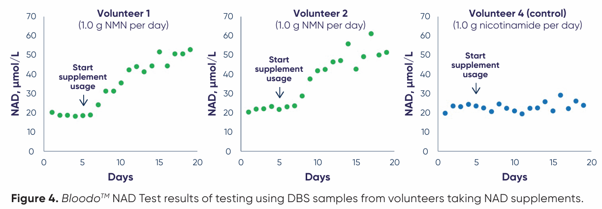 BloodoTM NAD Test was used to measure NAD levels from DBS samples taken from volunteers who were using NAD supplementation. Initially, all volunteers provided DBS samples for 5 days without any supplementation in order to establish baseline NAD levels in their blood. All samples were collected first thing in the morning before any food or drink intake. From the 5th day, three volunteers took 1 g per day of nicotinamide mononucleotide (NMN) in the morning, while the fourth volunteer, serving as a control, took 1 g per day of nicotinamide. The results are given in Figure 4 and show that BloodoTM NAD Test measures NAD level changes in the blood after using NAD supplements.