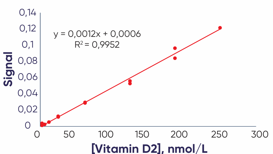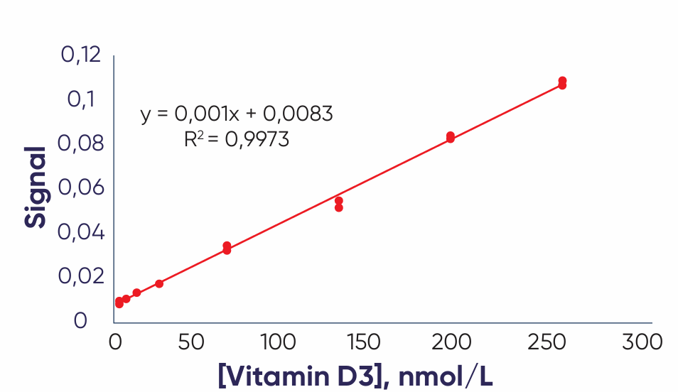 Vitamin D3 and D2 is measured according to a calibration curvereceived against the added Vitamin D3 and D2 standards in real human blood (Figure 1 and Figure 2). A typical calibration curve is conducted using Vitamin D3and D2 concentration range of 6.2 - 250 nmol/l (accounting for dilution), enabling the determination of Vitamin D3 and D2 in DBS samples within this range. Acceptance criteria for error margin is < 60 %. Error margin of the BloodoTM Vitamin D Test for Vitamin D3 is 25 % and for Vitamin D2 – 33 %.